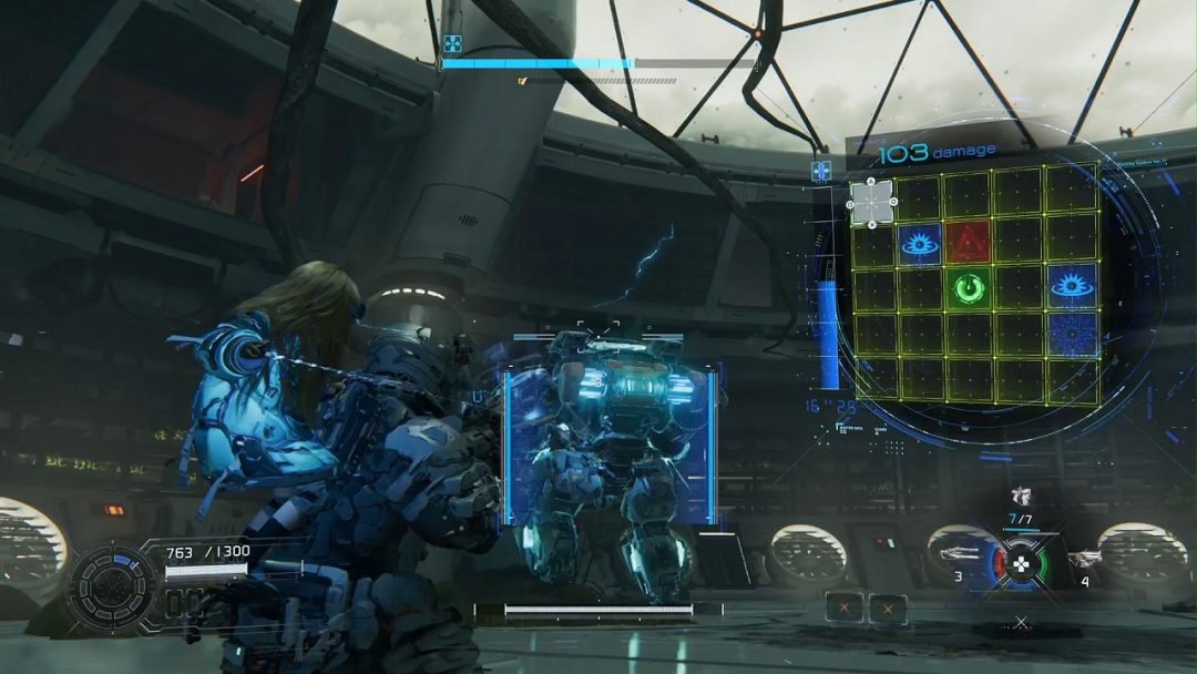 では、作品の中核となっている戦闘アクションから触れていこう。本作はハッキングをイメージした一筆書きのパズルと、敵の弱点部位を狙うガンシューティングを交互に行い、敵を倒していくゲームになっている。パズルに回答することで敵の弱点があらわになり、そこを攻撃して敵を倒すという流れをたどる。逆に、敵の特定部位を攻撃することでパズルの回答が可能になる、という流れもある。