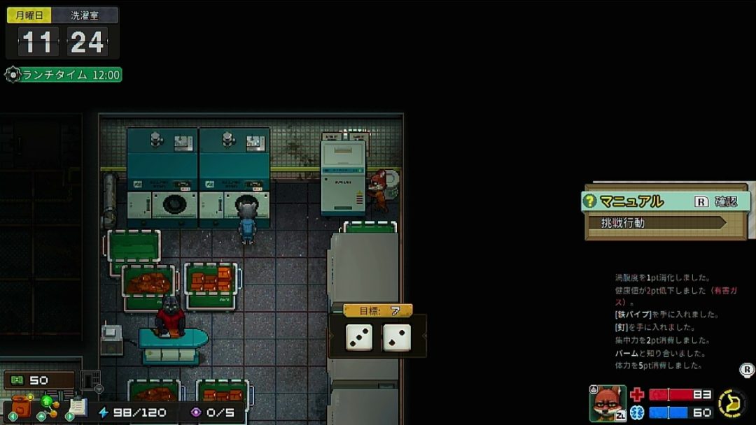 仕事内容を書いたメモを探していると、どうやら誰かがメモが書かれた壁の前に機材を置いてしまっていたらしい。さっそく機材を動かそうとすると、ダイスロールが始まる。本作では、あらゆるタイミングでダイスロールが求められる。力がいる物の移動や、奥に入り込んだアイテムの入手、中には囚人へのスリや看守から逃げる時など、さまざまな場面でダイスを振ることになる。成功率を上げるには、主人公のステータスを上げるほか、刑務所内で覚えられるスキルなども重要となる。刑務所でどういった経験をしたかが、さまざまな場面での成功に関わるかたちだ。