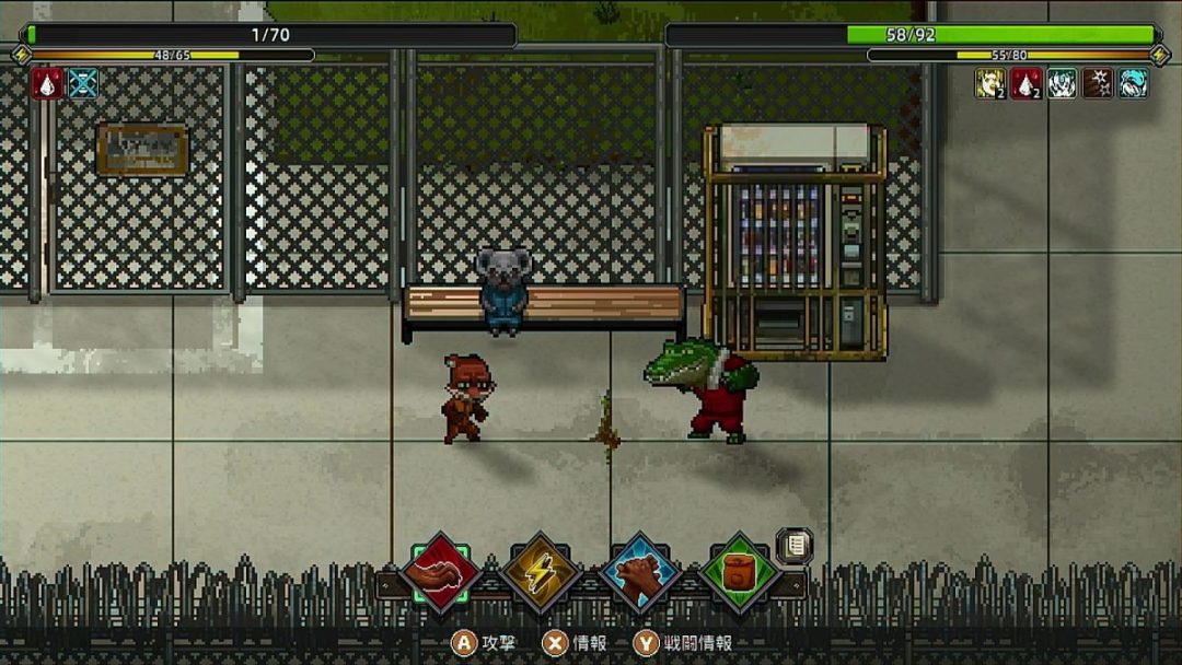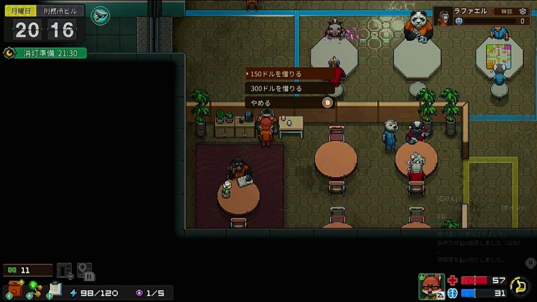話しかけてきたのはワニの囚人のクランジ。やたらと高圧的に喋ってきたのだが、どうやら金が欲しいらしい。カツアゲだ。このカツアゲに対して「半分を渡す」という選択肢もあったのだが、せっかく稼いだ金をそうやすやすと渡したくはない。ここは武力で対抗し、驚異的な新人キツネとして刑務所にその名と恐怖心を響かせようではないか。そういった態度を取ると早速戦闘が始まる。戦闘はターン制のRPG形式のバトルとなっており、刑務所内で手に入れたアイテムやスキルなども使うことができる。そしてトーマスは、あっさりと負けた。