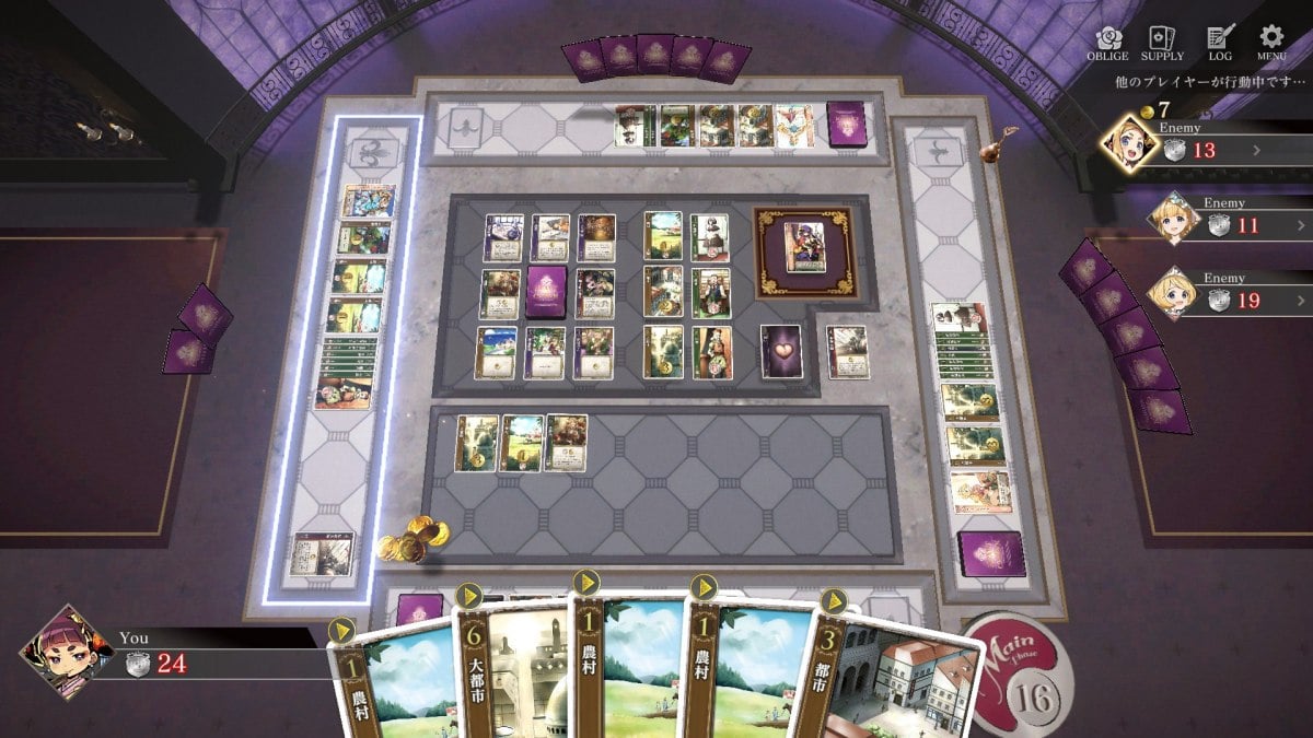 この「プリンセス擁立」のシステムこそが『ハトクラ』最初の面白いポイントとなる。本作に登場するプリンセスたちはそれぞれ異なる恩恵を持っているのだ。擁立した時点で継承点(勝利点)が6点得られるルルナサイカ。1ターンに1回だけ捨て札のカードを拾えるベルガモット。いらない行動カードを廃棄して、廃棄したカードのコスト分違うカードを購入できるオウカなど、どのプリンセスを擁立するかによって、今後のプレイスタイルに大きな影響を与えていく。