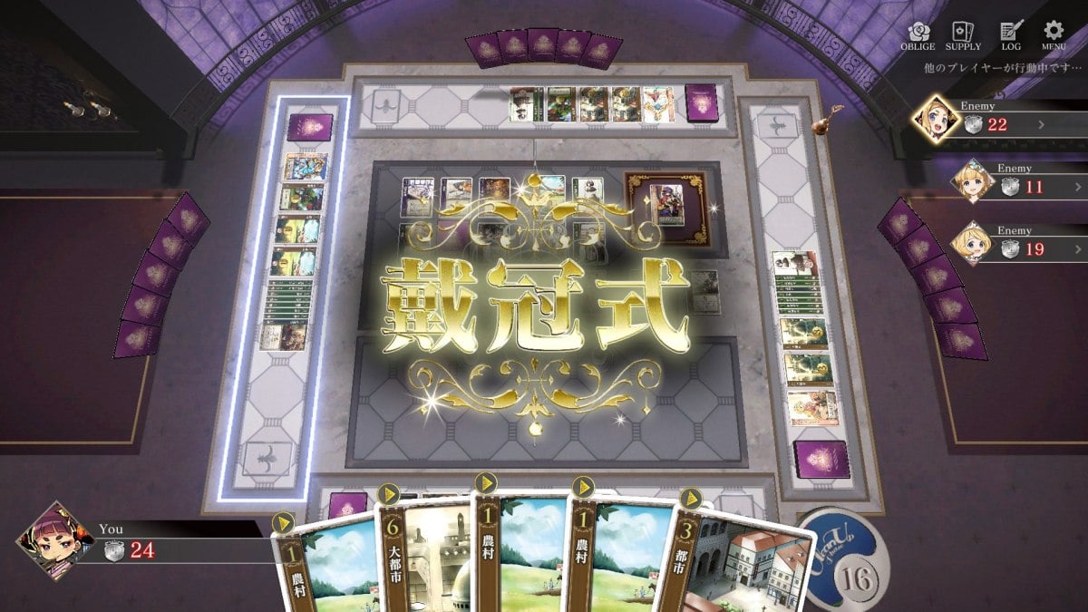 それを特に感じさせるのは、プリンセスを擁立させたあとに起こる「継承点レース」だろう。本作のゴールは継承点を20点にすること。そのために1枚で3コイン獲得できる「大都市」や、強力な効果を持つ行動カードを購入してデッキを回したいところ。
