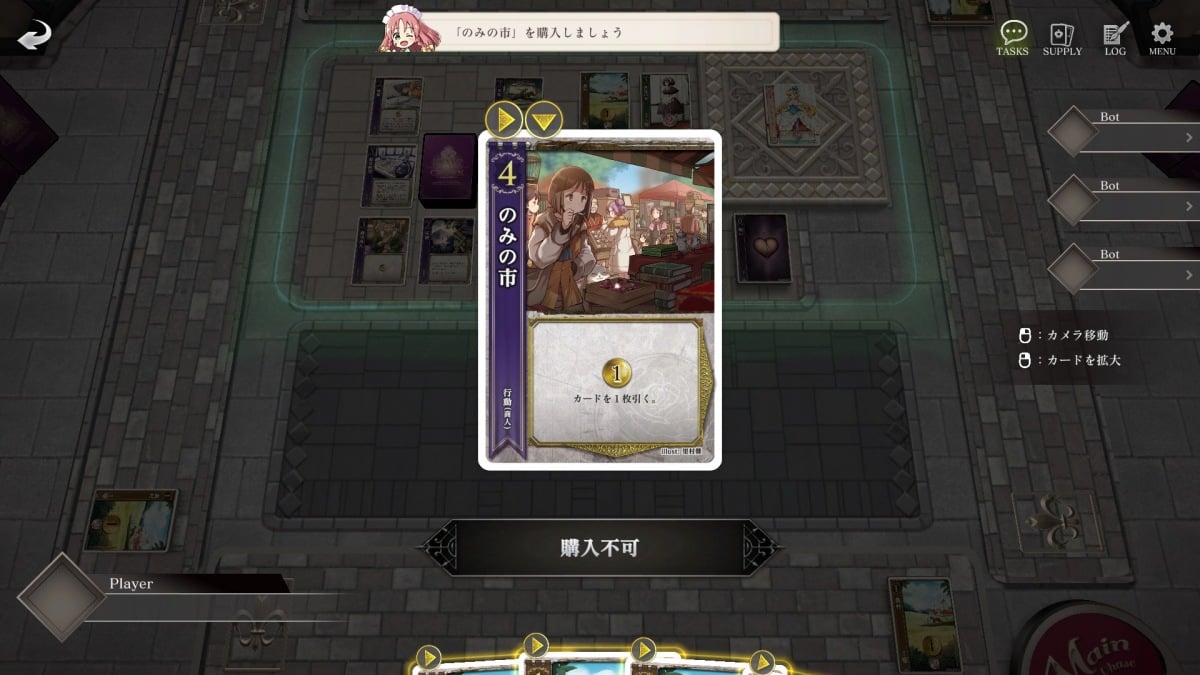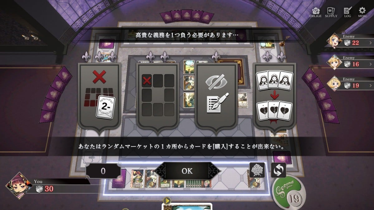 しかし、これが本作のある種のジレンマであり、駆け引きを生む要素となるのだが、本作で継承点を得る方法は「カードの購入を飛ばして継承点カードを手札から場に出すこと」となっている。つまり、継承点カードを出すターンはデッキの強化ができないのだ。