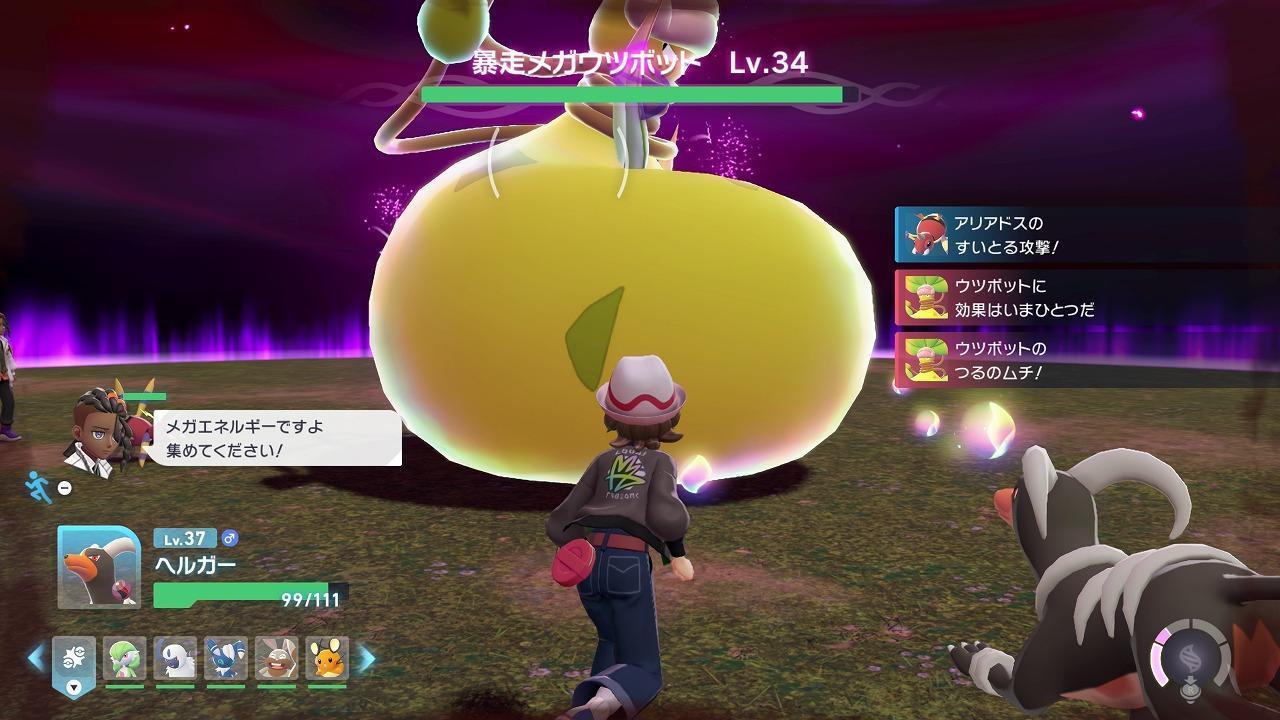 テラレイドバトルを「リアル」に描くとこうなる、という感覚であった。具体的な内容としては、連れ歩きの状態からパートナーに向けて技の指示を出し、攻撃を通じてフィールド中央で動き回るメガウツボットのHPを0にすれば勝利となる。巨大なメガウツボットは毒を撒き散らしたりと範囲攻撃を仕掛けてくるため、プレイヤー自身の回避行動はもちろん、パートナーポケモンに関しても、技を使っていない時間はプレイヤーを追随するという性質を活かして回避する。攻撃を繰り返したり、フィールドに発生するメガエネルギーを回収することで、一定時間のメガシンカが可能になるため、対応ポケモンが手持ちにいる場合は積極的に狙っていきたい。