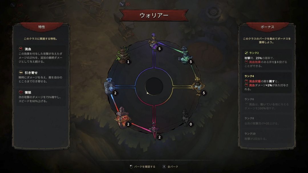 同じカテゴリーのパークは一定数集めることでもボーナス効果が発動する。たとえば「ウォリアー」カテゴリーのパークを2つ取得すると、攻撃時に25%の確率で流血効果のある斧を投げる特殊効果が発動する。チャンピオンの能力や装備とのシナジーを考えてパークを選択するのが理想だが、そこまで細かく考えずとも、同じカテゴリーのパークを取り続けるだけでもキャラクターはどんどん強くなっていく。複雑になりがちなビルド要素に適度なカジュアルさをもたらしていて、個人的にはいいシステムだと感じた。