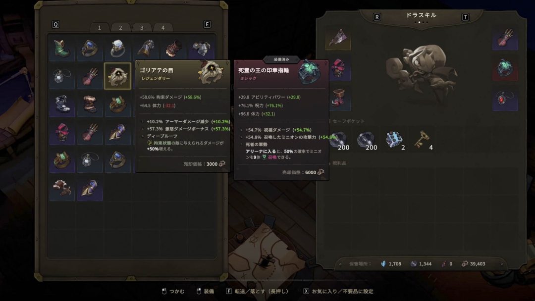 本作の装備アイテムにはコモンからミシックまで6段階のレアリティが設定されている。高レアリティになるほど装備の能力値や付帯効果が強力になっていき、レジェンダリー級とミシック級のレア装備には固有能力がつく。基礎能力値と付帯効果はランダムで決定されるので、トレハンのやりがいや、装備の取捨選択のおもしろさは現時点でも十分に感じられる。