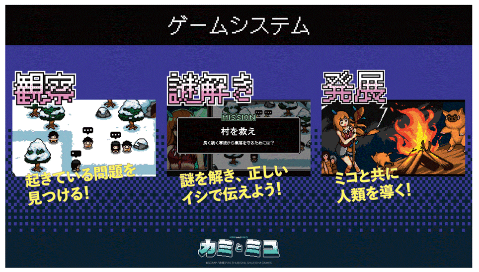 『カミとミコ』は、少女ミコと共に現代知識を駆使して人類史上の問題に立ち向かっていく、世界創造謎解きアドベンチャーゲームである。本作の舞台となる100万年前の世界では、ある集落が滅亡の危機に瀕していた。凍えるような風にさらされ続ける中、イノシシにも襲われて、人々は疲弊していた。