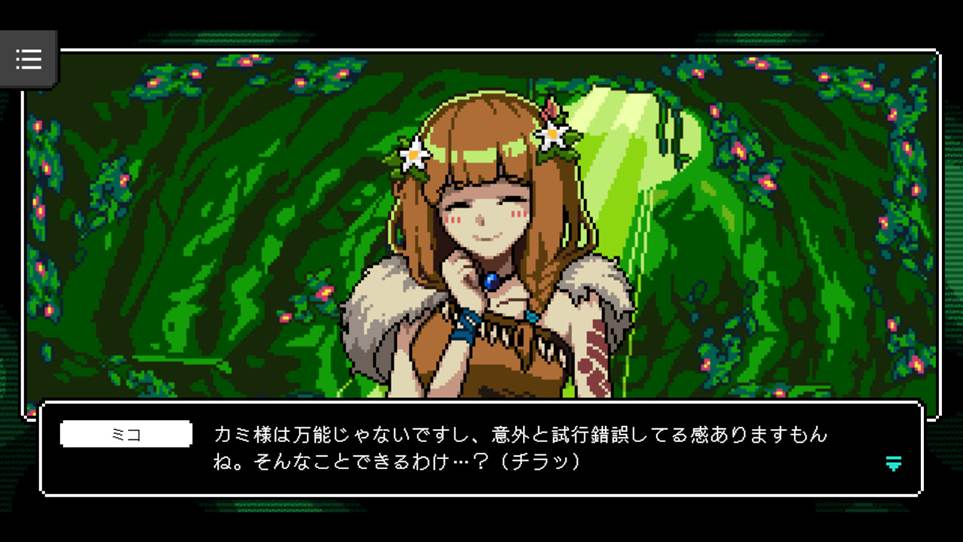 本作のメインキャラクター・ミコは、そんな集落に住む一人の少女である。自ら巫女として生贄になる道を選んだ彼女は、禁術を使用してカミを呼び起こす。プレイヤーはカミ様となり、ミコに神託を与えることで、まずは集落の危機に立ち向かう。また本作ではミコが転生を繰り返し、時代ごとに異なる姿を取りながら、カミと呼ばれるプレイヤーと共に人類の歴史を歩んでいく。現代知識で飢餓や疾病などに立ち向かう、カミとミコの人類史を追う旅が繰り広げられる。