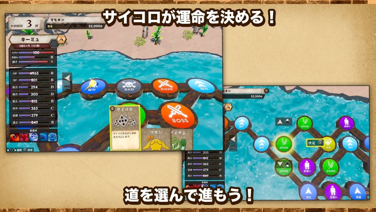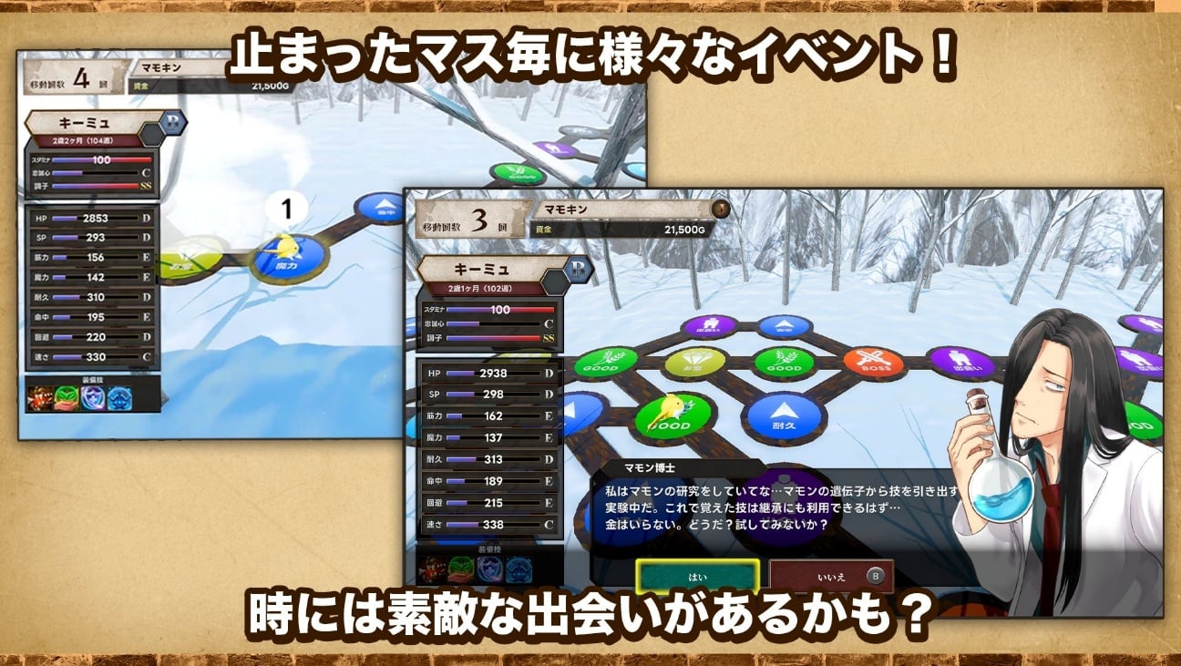 世の中にはモンスター育成シミュレーションがたくさんありますが、本作の特徴として挙げられるのはやっぱり「遠征」という要素ですね。サイコロを振って進行するスゴロク形式の育成システムなんですが、色々な選択肢のなかから育成方針を決めることができます。ランダム性もあるため「脳汁が出る」と思っていて、他のゲームにはないような要素だと自負しています。