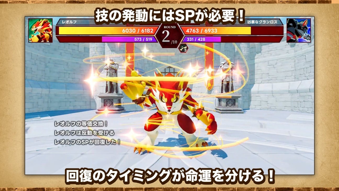 本作は1対1のラウンド制コマンドバトルを採用しています。技を出すのにはスキルポイントを使用するのですが、このスキルポイントの使い方が戦況を大きく左右します。MPみたいな感じですね。スキルポイントは育成中に上げていくことができるので、育成段階からどれくらい獲得しておくかを考えるのも重要になってきます。