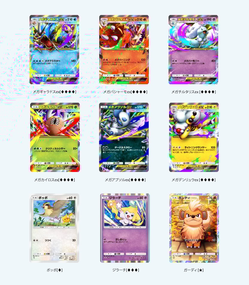 今回は、新しい拡張パックとして「メガライジング メガギャラドス」「メガライジング メガバシャーモ」「メガライジング メガチルタリス」が登場するという。メガシンカポケモンとして、メガギャラドスex、メガバシャーモex、メガチルタリスexなどが紹介。気絶すると相手が3ポイントを取得するそうで、強力ながら慎重な運用が求められそうだ。