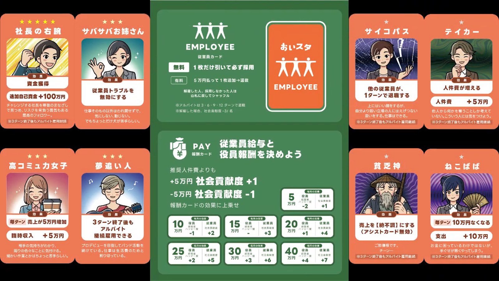 次の経営フェーズでは、1か月を1ターンとして12か月分の経営をおこなう。売上や各種支援を獲得できるカードを引き、それらの効果を得た上での収支を計算して業績を確定させるまでが1ターンとなる。思わぬ効果が発生するハッピー/トラブルカードというものも引く必要があるようだ。また、サイコロを使って融資を受けたり、従業員の採用や解雇、あるいはアルバイトを正社員登用したりといったことを任意でおこなえる模様である。