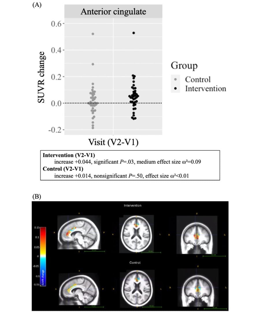 PET撮影に用いられたのが[18F]フルオロエトキシベンゾベサミコール(FEOBV)である。フッ素-18という放射性同位体で標識をつけた物質で、小胞アセチルコリントランスポーターに選択的に結合する。そしてこの物質を辿れば、神経伝達物質としてアセチルコリンを用いる脳内のコリン作動性神経のシナプス終末の分布を可視化することができる。測定の結果、脳トレゲームをプレイしたグループだけに、前帯状皮質において2.3%という有意なFEOBV結合の増加が見られたとのこと。