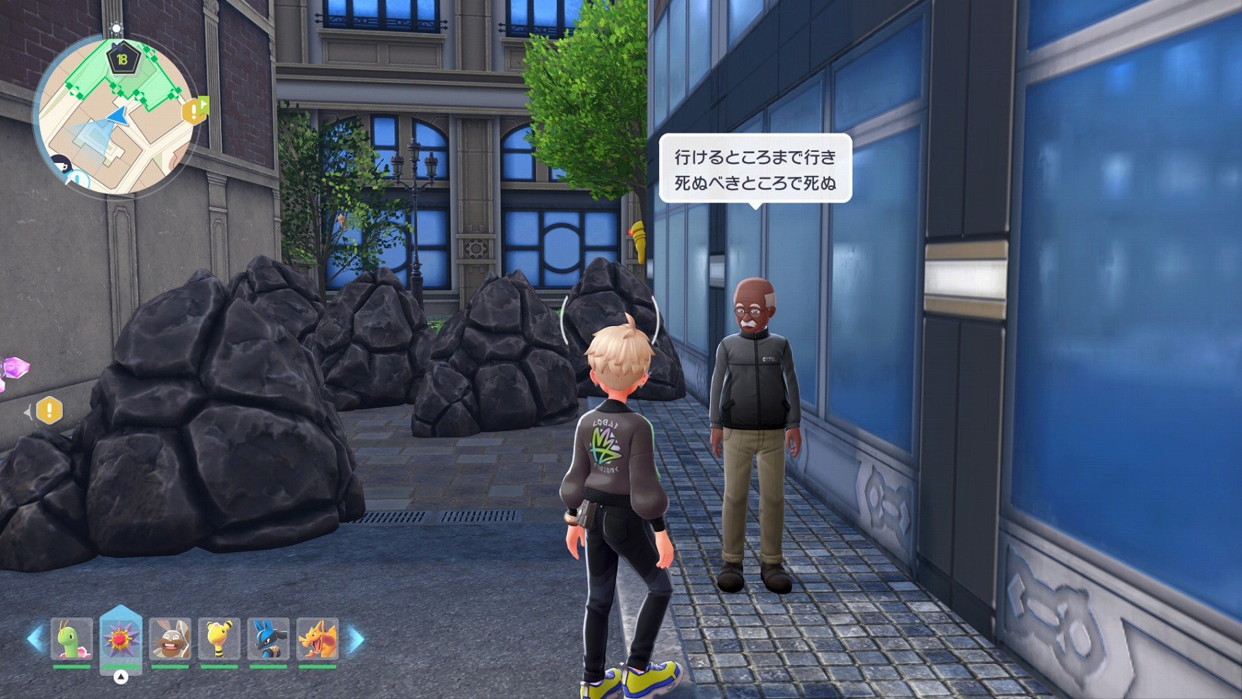 ミアレシティには多種多様な人々が暮らしており、サイドミッションの依頼者のほか、会話が可能なNPC、吹き出しだけで発言が表示されるNPCまでさまざま。このうちNPCの吹き出しのセリフは移動しているだけでは見逃しがちながら、よく読むと異様な発言も入り混じっていることが話題を博している。たとえばひと際注目されているのが18番ワイルドゾーン近くにいるおじいさんのセリフ。何の変哲もないセリフのNPCに囲まれながら「行けるところまで行き 死ぬべきところで死ぬ」という悟りを開いたかのような物言いをしており、国内外のプレイヤーに強烈な印象を残しているようだ。