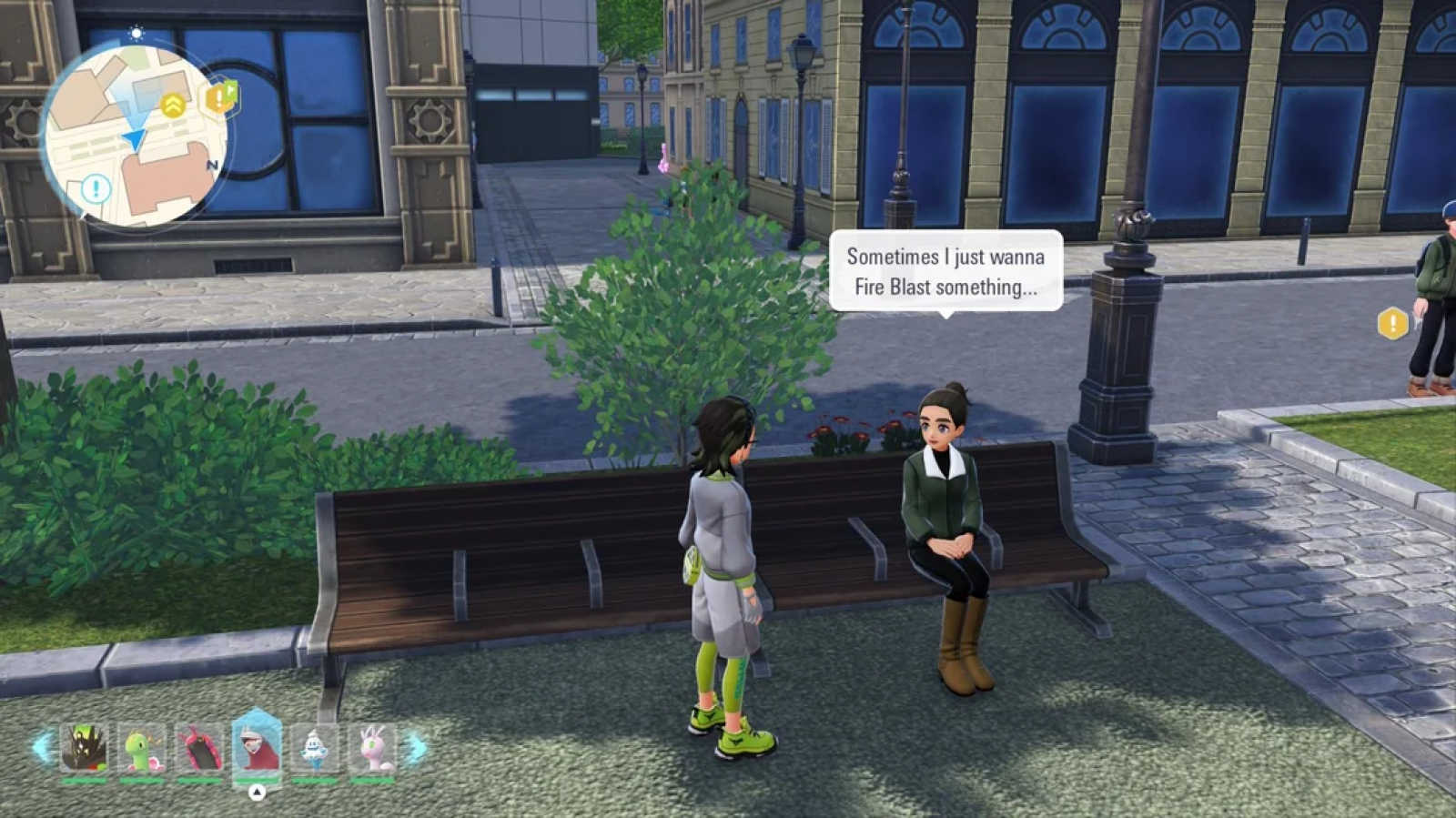 またオトンヌアベニューのベンチに座る女性は日本語版では「もう!だいもんじを浴びせたい!」と呟いており、何かむしゃくしゃすることがあった様子。日本語版ではどこかかわいげもある一方、英語版では「Sometimes I just wanna Fire Blast something…(ときどき、ただ何かにだいもんじを浴びせたくなるんだよね……)」と本当に何か燃やしそうな切迫感のあるセリフになっている。ミアレシティはかなりストレス社会なのかもしれない。