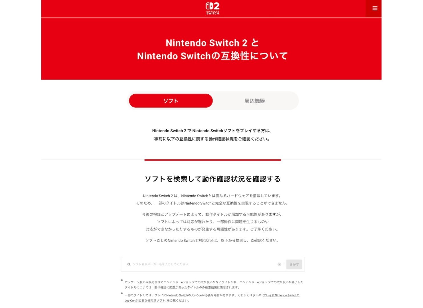 任天堂公式サイトの「Nintendo Switch 2 と Nintendo Switchの互換性について」ページがひっそり刷新。検索ボックスが用意されて調べやすく