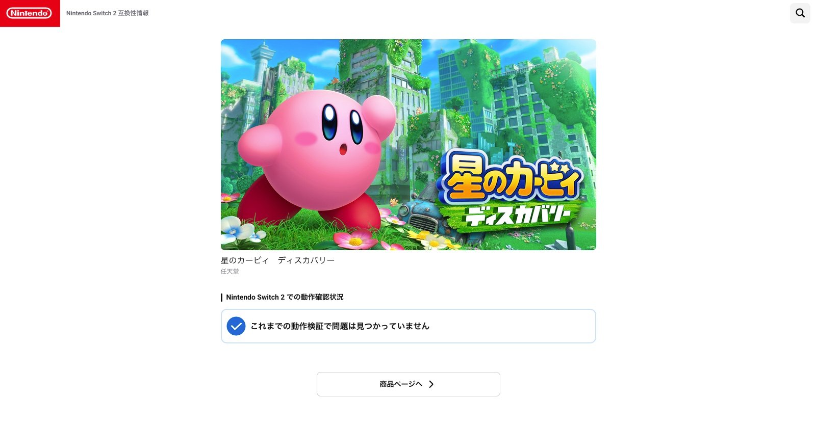 検索してヒットしたタイトルのページにアクセスすると、Nintendo Switch 2での動作確認状況が掲載されており、そこからニンテンドーeショップのストアページに移動することもできるようになっている。以前互換性に問題があったタイトルで、アップデートにて対応された場合にはその更新情報が掲載。また、一部でNintendo Switchと異なる挙動があるがゲームの進行には問題ないタイトルでは、その異なる挙動についての詳細が記されている。