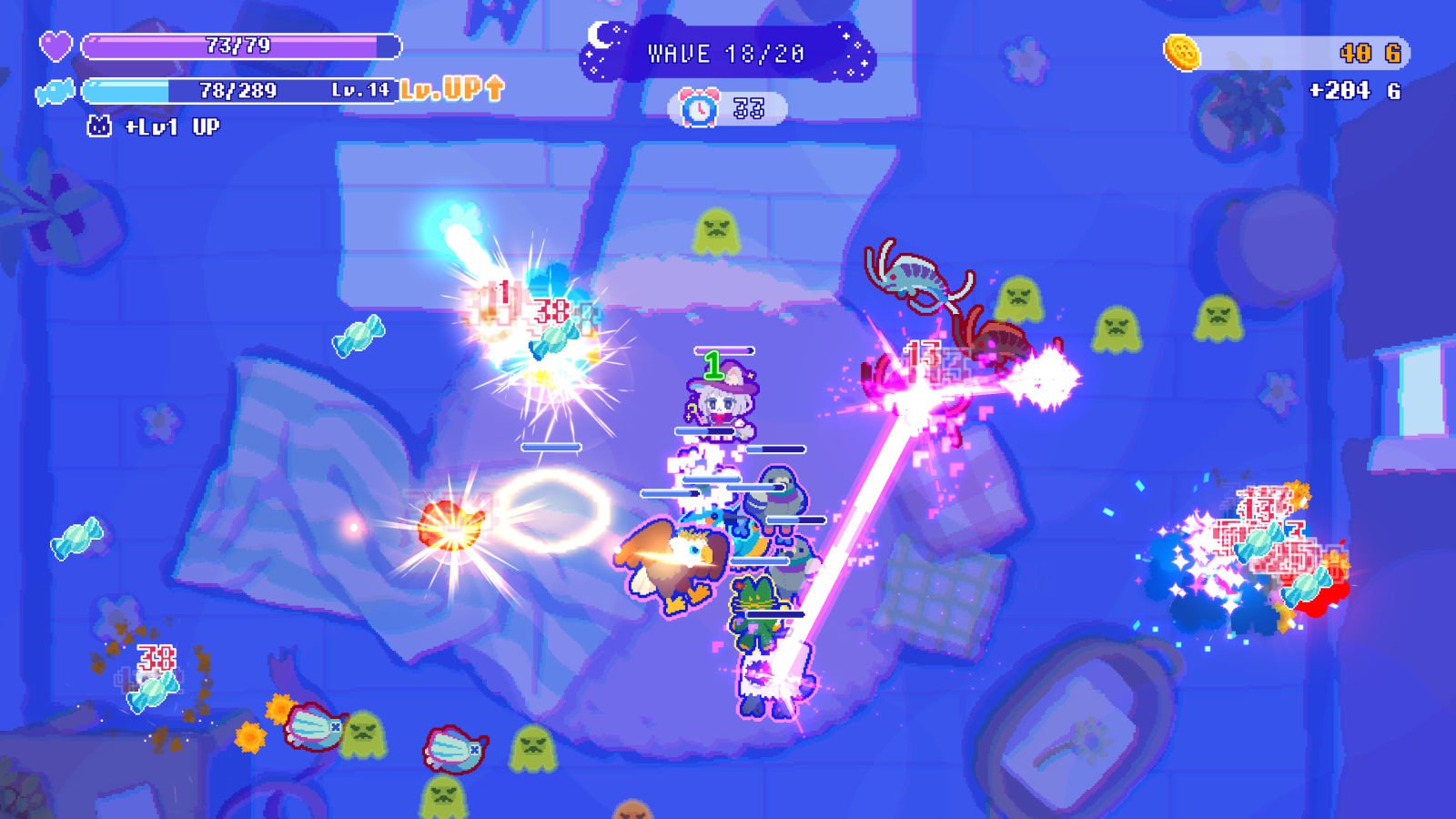 少年テテはぬいぐるみたちに守ってもらい、おばけと対峙していく。本作のメインキャラクター・テテは、おばけと戦う力をもっていない。そこで本作では、テテはおばけから逃げながら、それぞれ個性的なぬいぐるみたちにおばけを退治してもらう。たとえば、ちょこまか走り回るミニハムは、手に持った小枝で近接攻撃。うたた寝が好きなねむキリンは、攻撃があたったおばけの移動速度ダウン。疲れたヒトを放っておけない優しいシマは、テテを回復してくれる。本作では40種類のぬいぐるみたちが登場。本作では攻撃や状態異常から回復まで、個性的なお友達を仲間にしておばけから逃げ切るのだ。