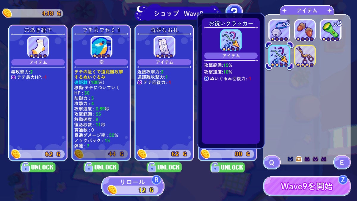 おばけから逃げ切ると、集めたゴールドで買い物が可能。新しいぬいぐるみや、テテやぬいぐるみを強化する100種類以上のアイテムなどが購入できるようだ。また本作では、20種類以上のコスチュームが用意されている。テテは着ている洋服によって、能力が変化。遠距離攻撃力が増えやすい衣装や、移動しないタイプのぬいぐるみの攻撃速度が2倍になる服などが存在する。本作では衣装やぬいぐるみ、アイテムを組み合わせて、上手くおばけ退治をやり切るのだろう。