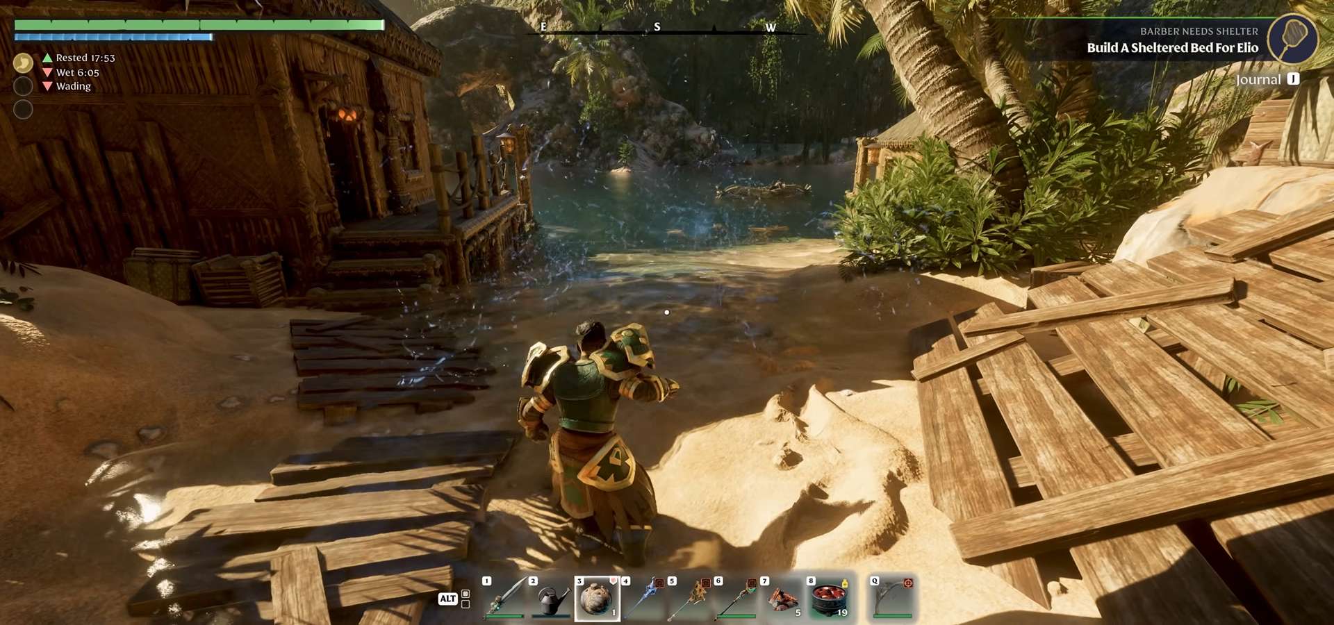 そんな本作に向けて第7弾となる無料大型アップデート「Wake of the Water」が配信された。アプデの目玉として、動的にシミュレートされた「ボクセル水」が導入され、既存のバイオームに池や湖が発生。プレイヤーは基本アクションとして「泳ぐ」「潜る」ことができるようになり、酸素の残量を管理しながら水中を探索することが可能となる。特に新たなバイオーム「Veilwater Basin」には広大で深い湖が広がっており、水面下では特別な資源や宝箱が見つかるという。