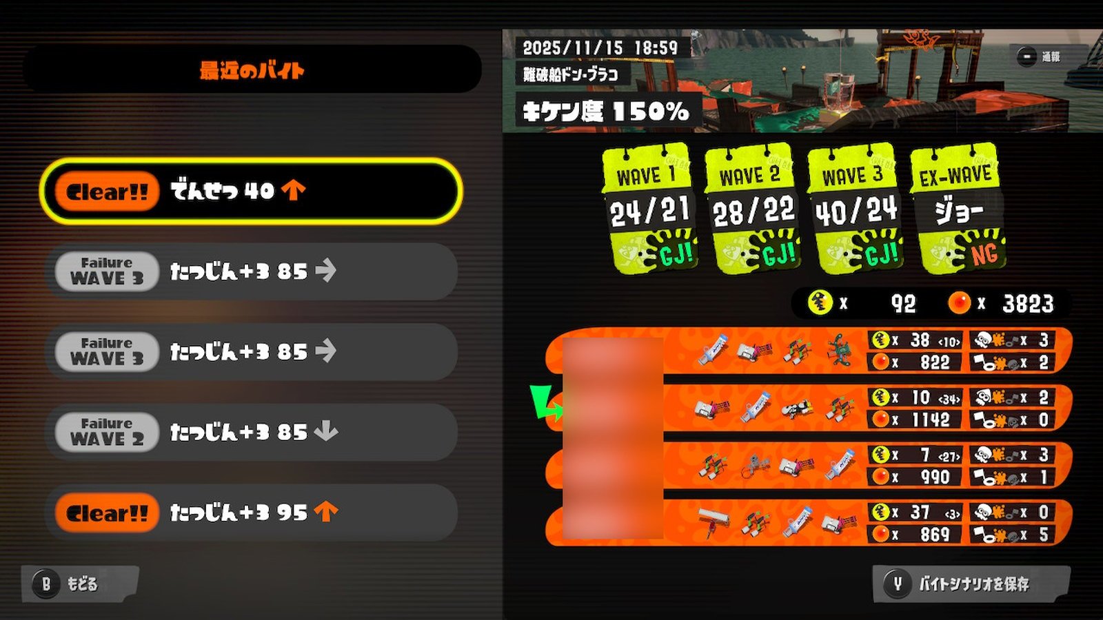 過去にはでんせつ999に到達したこともあるステージですが、さすがに久しぶりのプレイで高いキケン度に挑むのはマッチングした方に申し訳ないと思い、今回はたつじん+3まで落としてプレイすることにしました。キケン度がさほどでもないため気楽でありつつも、味方がまだバイトのコツを掴めていないことも多いランク帯だと思います。リハビリの身にはちょうど良い難度で、どういった部分をカバーするとうまく行くのか、常に考える必要があるところが楽しかったですね。昔のように連戦連勝とはいきませんでしたが……。3のサーモンランはとってもおもしろかったので、今後のナンバリングでもサーモンラン続投、あるいはそれ以上の協力型マルチが来てほしいものです。