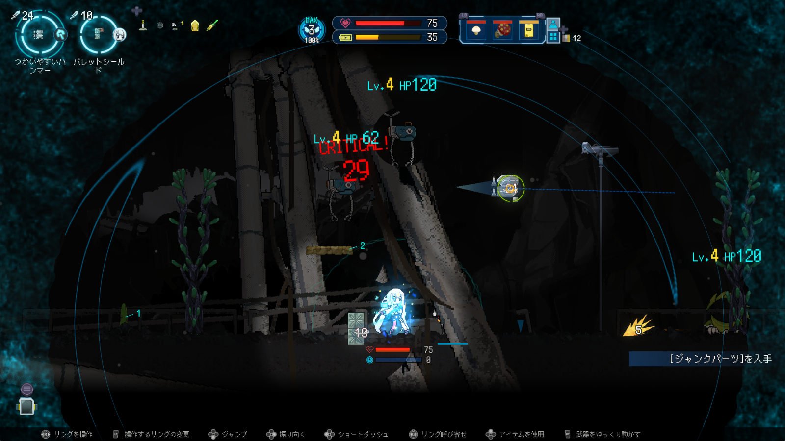本作にはクラフト要素があり、パーツをカスタマイズして武器を作っていきます。たとえば銅のブロックを四角に並べると高耐久パーツに変わるなど、置き方による変化も存在。爆弾や銃なども作れるようになっています。ただそうした機能を使いこなせるかどうかは別です。本作は特に中盤以降敵が硬く、素早く殲滅するために基礎攻撃力が何より大事だと思っているので、毎回気がついたら攻撃力の上がるトゲと剣で出来た謎のオブジェが誕生。ダメージは出るので問題ないんですが、もうちょっと遊び心が欲しいと弄っては、気がつくとこの形に戻ってきています。あと本作のレリックは強力な強化も多数存在。やっぱり効果が派手だと選ぶのが楽しいですね。