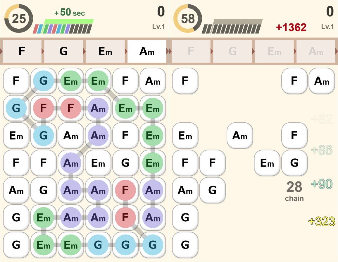 ゲームプレイでは制限時間内にコード記号の書かれたブロックをなぞって消していくことになる。ブロックに触れると書かれているコードの音が鳴り、2つ以上のブロックをつなげれば消すことが可能。一度に多くのブロックをつなげるほどchain数が増え、高得点となる。また、ブロックが消えている間に別の場所でブロックをつなげれば、chainを継続することが可能。1つの長いchainをつなげても良し、複数箇所でつなげても良しだ。ただしブロックが消えるのは早めなので、もたついてするとすぐにchainは途切れてしまうだろう。