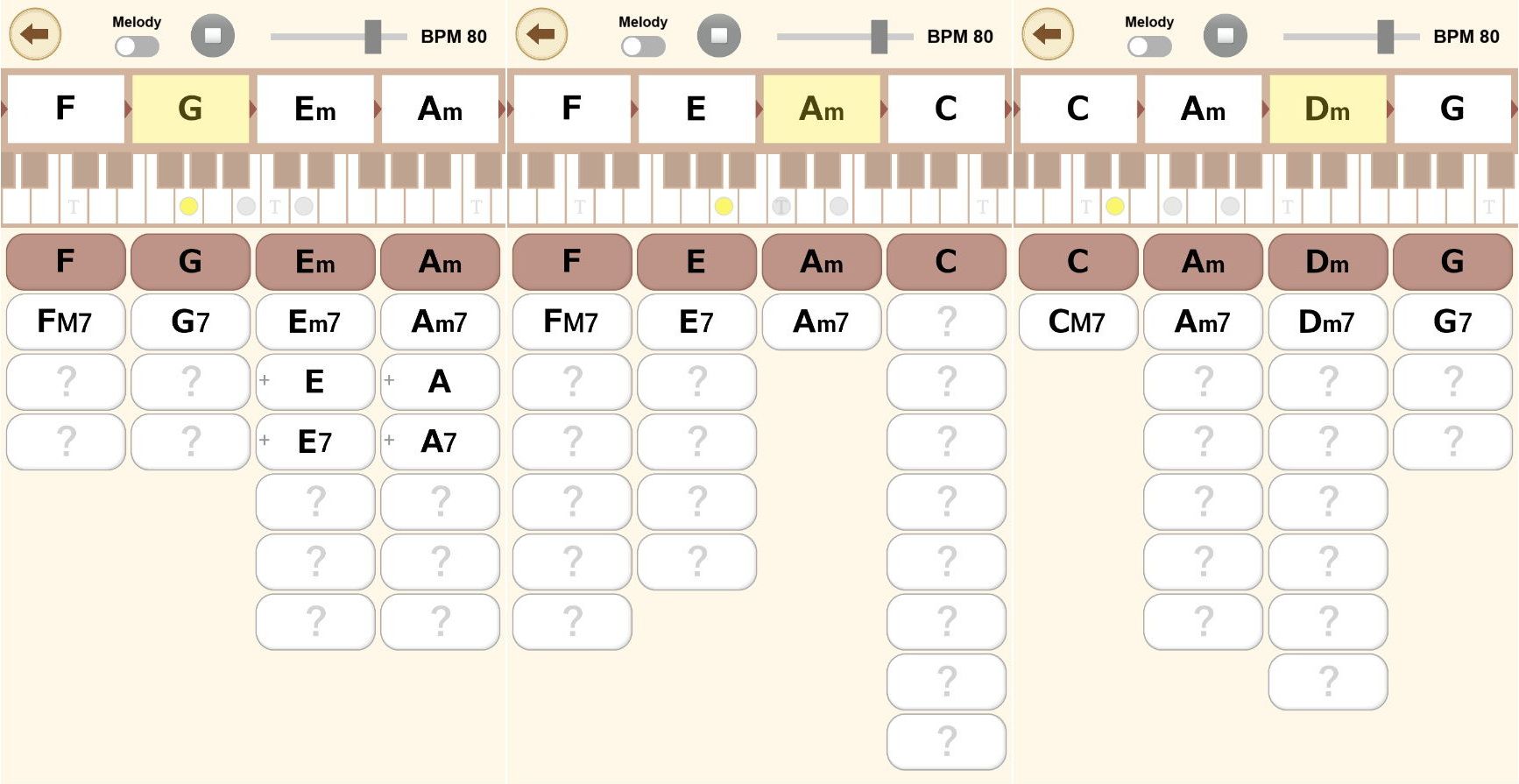 ゲームは好きなキーとコード進行を選んでプレイすることになる。遊ぶことができるのはポップスなどで多用される「王道進行(4536進行)」、1999年に「丸ノ内サディスティック」で使われたことに由来する「丸サ進行」、ジャズのアドリブなどで用いられる循環コード「1625進行」の3つのコード進行となっている。どれも広く使われるコード進行だ。