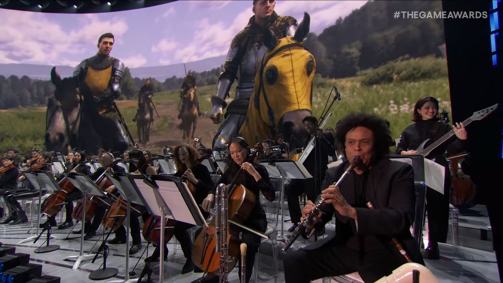 今年のTGAでもEustache氏は特別メドレーの奏者として登壇しており、今回はひと際話題を巻き起こしているようだ。特別メドレーは『キングダムカム・デリバランス II』の楽曲から演奏がスタート。舞台に向かって右端ではEustache氏がフルートとみられる楽器を縦に構えて演奏しており、いつも通り表情豊かで、体を揺らしながらリズミカルに奏でる姿を見ることができる。