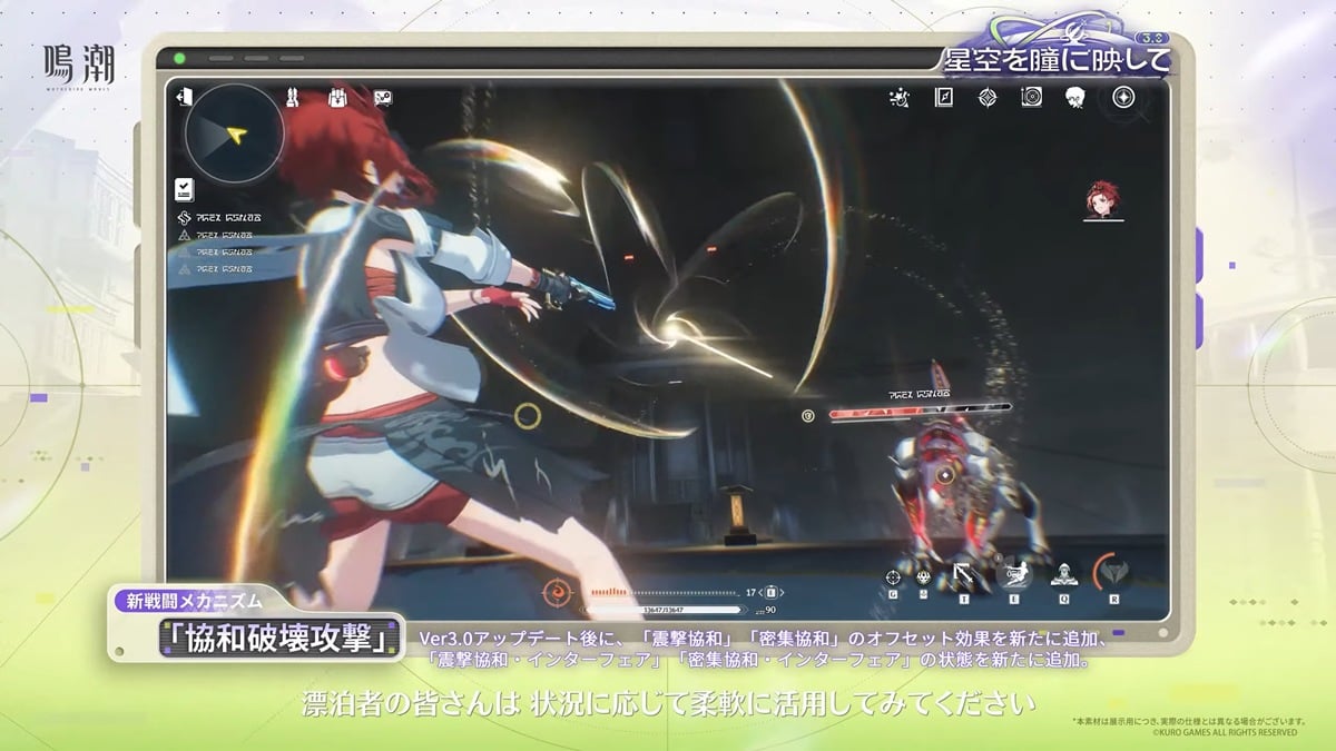そして、バトルの大きな変化として新たに「不協和ギミック」が追加される。不協和ギミックは、Ver3.0以降、共鳴者の攻撃で敵に不協和値を蓄積させることで敵は不協和状態に陥る。不協和状態の敵に攻撃することで「協和破壊」で大きなダメージを与えることができる。なお、強敵に対しては「協和破壊攻撃」をおこなう必要があるそうだ。