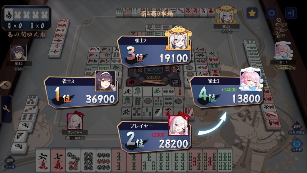 ……が、そこで運は尽きた。最後の1枚が来ないのだ。目当ての牌を引けないし、他プレイヤーも出さない状況が続く。そして迎えたラスト1周。私の前のプレイヤーがチーを宣言し、本来そのプレイヤーが引くはずだった牌がずれ込んで私の手元にやってくる。掴んだのは赤ドラの五索、4位のプレイヤーが一縷の望みを賭けて待っていた最後の1枚だった。ついでにゲーム終了の最後の手番で完成したときのボーナスも乗るおまけ付き。リーチを宣言している手前捨てるしかない。こんなことがあるのかという絶望的な点数移動を、私は眺めているしかなかった。
