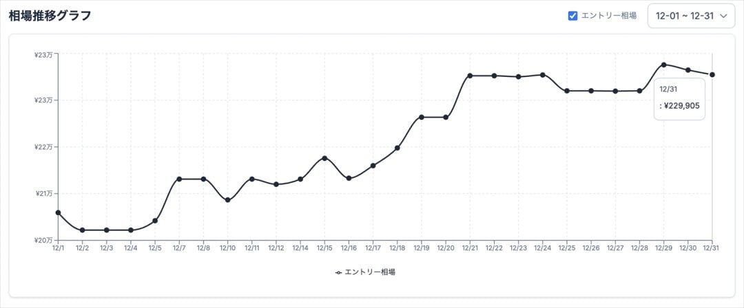 レポートによれば、すべての価格帯で相場価格が大きく上昇しており、特に12月中旬に急激な変動が見られた。まず、RTX 5060やRX 9060 XTなどのGPUを含むエントリークラスでは、相場価格が12月1日時点の20万3345円から、31日時点には22万9905円へと上昇。約2万5000円の値上がりとなった。比較的手に入りやすいはずのエントリー帯でさえ、短期間で大きく上昇している。