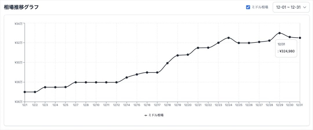 続いて、RTX 5070やRX 7800 XTといった人気GPUを含むミドルクラスでは、12月1日の26万9980円から、31日には32万4980円へと上昇。約5万5000円の値上がりと、3クラスの中で最も大きな上昇幅を記録した。