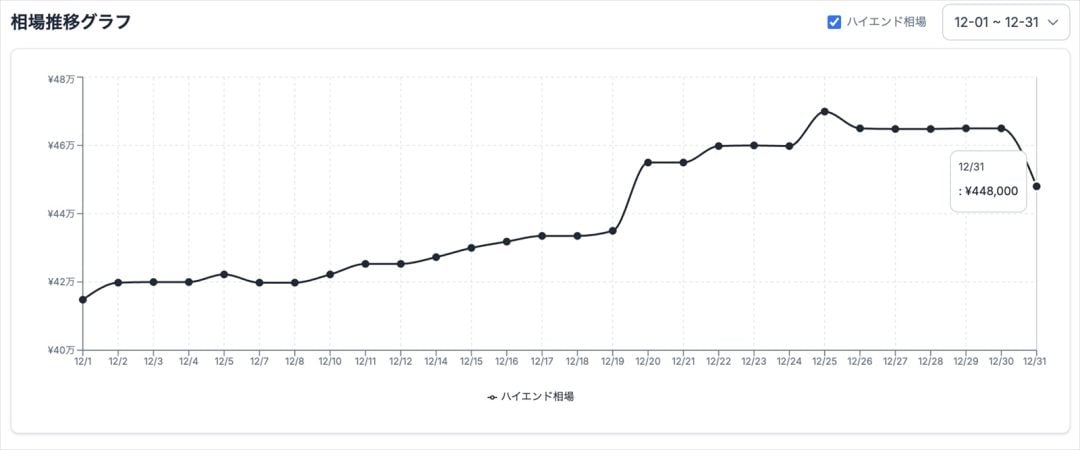 ハイエンドクラスも例外ではない。RTX 5090やRTX 5070 Ti、RX 9070 XTなどを含む構成では、12月1日時点ですでに41万4800円と高額だった相場価格がさらに上昇。25日には一時約47万円に達し、31日時点でも44万8000円と、月初から約3万円の値上がりとなった。