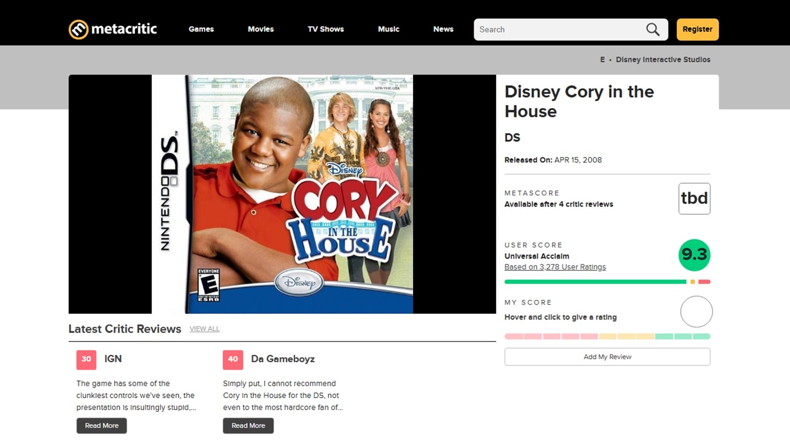 レビュー収集サイトMetacriticにて、2008年に発売されたとあるゲームが突如としてユーザースコアで高評価を獲得し、話題を集めている。話題の中心にあるのは『Disney Cory in the House』というアメリカのテレビドラマを原作とするニンテンドーDS(以下、DS)向けソフト。本稿執筆時点でユーザースコアで1位に位置する『Clair Obscur: Expedition 33』に迫る勢いをみせ、注目を集めている。