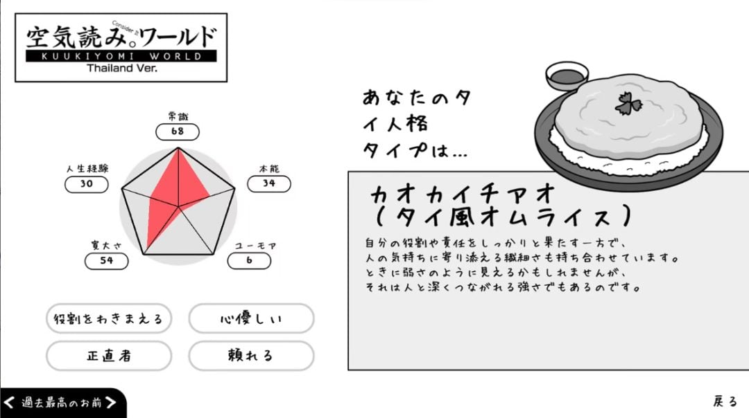 タイ人クリエイターが制作に携わり、収録されているシチュエーションは、タイの日常や文化を題材としたものとなっている。たとえば、水かけ祭り「ソンクラーン」で誰に水をかけるかの判断や、ウォーターガン型のウォシュレットで水圧をどう設定するか、さらにはガパオライスの屋台を舞台に、注文内容や振る舞いによって店側の反応が変化する場面なども用意されている。行動次第では屋台が炎上するなど、ユーモアを交えた展開も見られる。また、こうしたシチュエーションを経て表示される診断結果は、タイ風の表現でまとめられており、タイ料理やタイで親しまれている幽霊・オカルトといったモチーフが用いられる(関連記事)。
