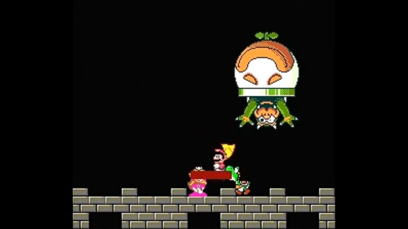 本来の『スーパーマリオワールド』では、クッパから解放されたピーチ姫がマリオにキスをした後にテキストが表示され、そこからエンディングがスタートする。ところが映像では、肝心のピーチ姫が消えてしまったため、ただマリオがヨッシーと見つめ合うばかり。BGMがしっかり鳴っているが、余計に物悲しい雰囲気だ。