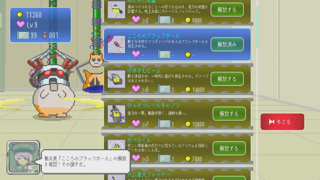 防衛戦の合間には、種を与えて信頼度をアップさせてステータスを強化したり、もちおを撫でて戦闘ボーナスを獲得したりといったもちおとの交流が待っている。当然もちおを愛でるだけではなく、集めたお金で攻撃を解放するなどの兵器としての強化も欠かしてはいけない。また、プレイヤーの上司にあたる「園長」ともちおのやりとりも本作の魅力の1つだ。