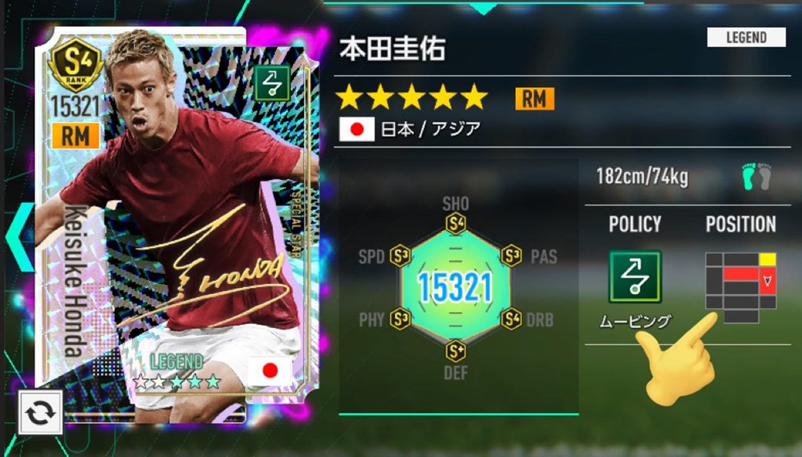 現実の本田選手はさまざまなポジションのプレイ経験があるが、ザッケローニ監督時代の日本代表でトップ下を務めていた印象が強い人も多いだろう。右サイドハーフも本田選手がよくプレイしたポジションだったとはいえ、AMの適正がないという性能は不自然だったともいえる。そもそもアンケートの選択肢にRMがなかったということもあるが、実際攻撃的ミッドフィールダーにはかなりの票が集まっていた。ゲーム内の“右サイド専”の本田選手に違和感を覚えた人は多かったのだろう。