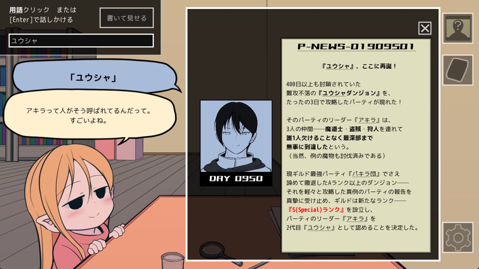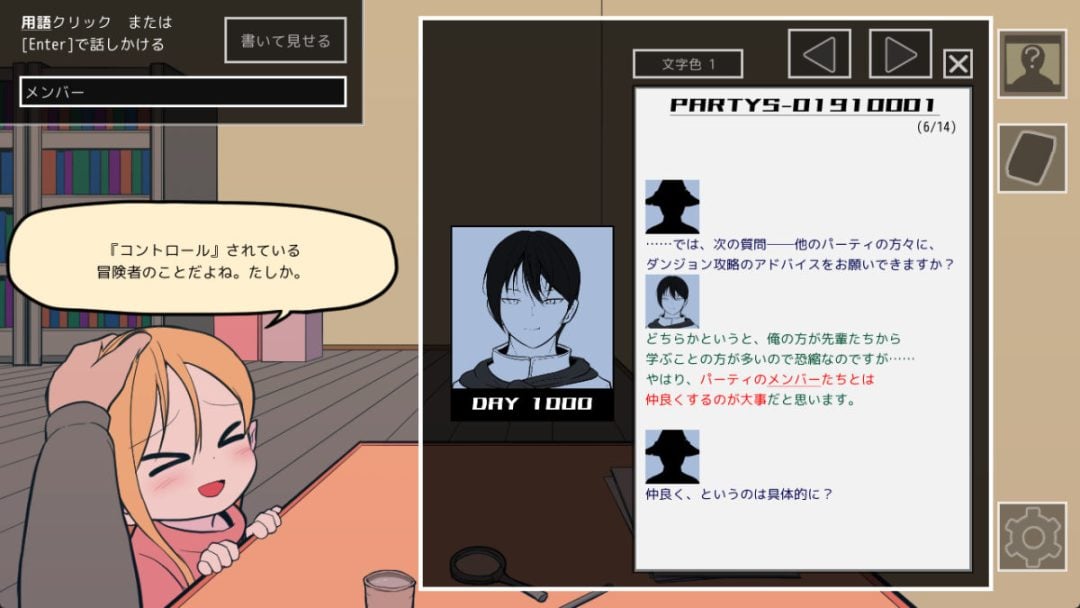 また本作では、アシスタントの少女が知っている用語の意味を教えくれるようだ。用語のクリックや入力によって、少女との会話が可能。たとえば「ユウシャ」と入力すると、アキラなる人物がユウシャと呼ばれていると答えてくれる。要素としては、画面左下にいる彼女は撫でることもできる。なお、本作の世界における「メンバー」とは、コントロールされている冒険者のことなのだという。多数の資料を読んで情報を整理していく中で、世界の真実も明らかになっていくのかもしれない。