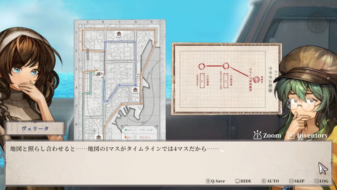ヴェリータの物語は、推理アドベンチャーとして展開される。基本的には、テキストや立ち絵によってストーリーが進行。ストーリー上で謎と相対した場合には、推理パートが展開される。プレイヤーは提示された資料や会話などから、謎の答えを推測。たとえばゲーム序盤では帳簿や地図などから、購入者名や購入者の居場所などを絞り込んでいく。本作では提示された情報の中から、ヴェリータと共にプレイヤーも謎を解いていくのだ。全6エピソードが収録予定とされており、公称プレイ時間は30時間以上。推理によって、各エピソードの顛末が変化する点も特徴だろう。