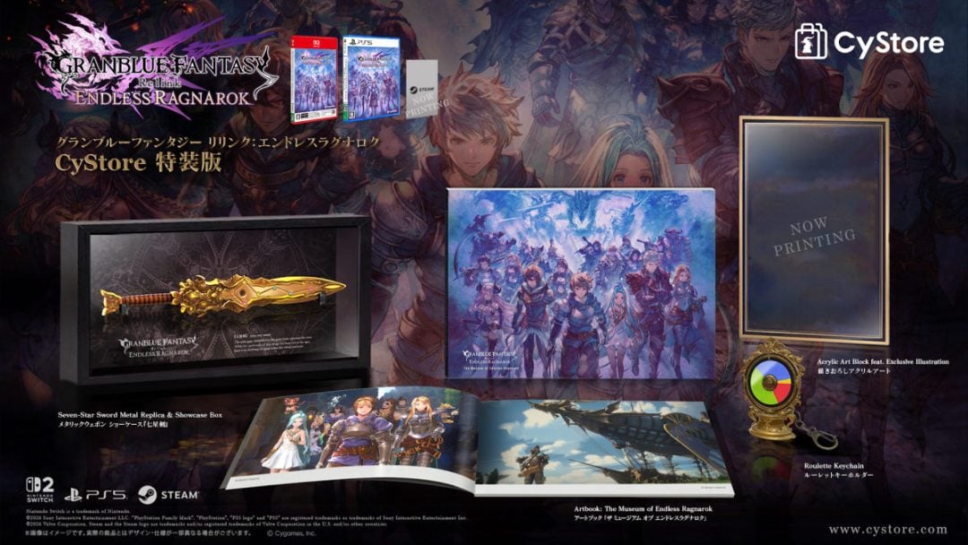 『GRANBLUE FANTASY: Relink – Endless Ragnarok』は、PS4/PS5/Nintendo Switch 2/PC(Steam)向けに7月9日リリース予定だ。通常版の価格は税込6930円。CyStoreではメタリックウェポン ショーケース「七星剣」やルーレットなどが付属する限定版も発売される。また前作『グランブルーファンタジー リリンク』所有者向けに、アップグレードキットが通常版税込3960円で発売。セーブデータの引き継ぎも可能とされている。