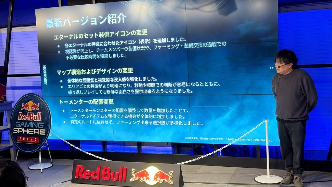 まずはDRIMAGE JAPANの竹本氏が登壇し、これまでのフィードバックを反映した新バージョンの紹介がおこなわれた。イベント時点のバージョン0.15では、従来色分けのみだった各エターナル装備に専用のアイコンが追加。絶えず移動しながら装備を吟味する本作において、視認性の向上は状況判断の精度に直結する。実際の試合中も、装備の見分けがつきやすくなったことで、立ち止まって迷う時間が減っている印象を受けた。