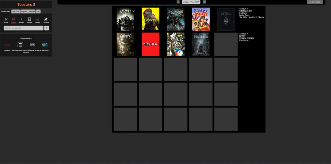 サイトを開くと9枚の枠が表示されており、枠をクリックしてゲームタイトルを検索する仕組みだ。検索には、ゲームの知識を収集・保存・公開することを目的としたウェブサイト「IGDB.com」のデータベースが活用されているという。IGDB.comには35万種類以上のゲームが登録されており、知名度の低い作品でも検索結果が表示されやすいことが特徴だ。9枠をすべて埋めると画像として保存したり、SNSで共有したりできる。