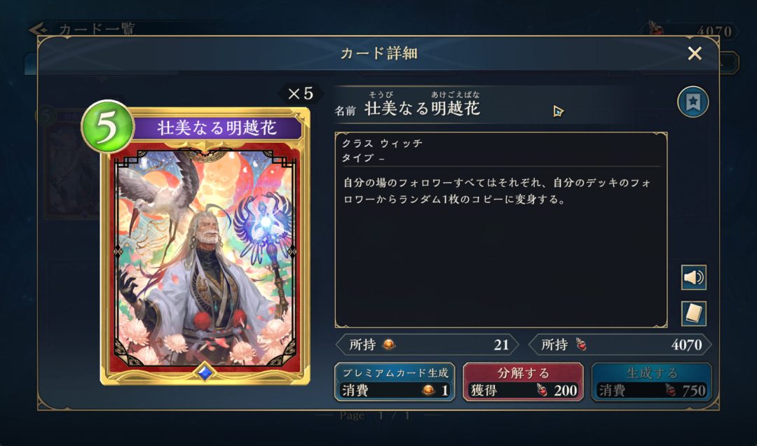 「壮美なる明越花」は、第5弾カードパック「花酔遊戯」のカードとして2025年12月に登場した、5コストのウィッチクラスのスペルだ。使用すると、自分の場のフォロワーすべてが、自分のデッキのフォロワーからランダム1枚のコピーに変身する。「花酔遊戯」環境ではその性質を利用し、盤面に低コストのフォロワーなどを多数並べた後、全部疾走持ちの「運命の黄昏・オーディン」へと変えることで、1ターンキルをするといった発想が登場。環境後期にはいくつかの勝ち筋を搭載した「OTKウィッチ」が、一部で話題にもなっていた。