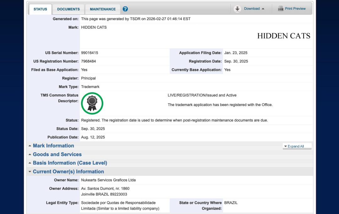 問題の商標は、ブラジルのデベロッパーNukearts Studioが米国にて登録している「Hidden Cats」だ。同スタジオは、イラストの中から猫を探すゲーム『Hidden Cats』シリーズを手がけており、同商標は昨年1月に出願され、9月に登録されている(米国特許商標庁)。同商標の適用範囲にはダウンロードゲームのほか、ダウンロード用の絵本やポスターも含まれる。