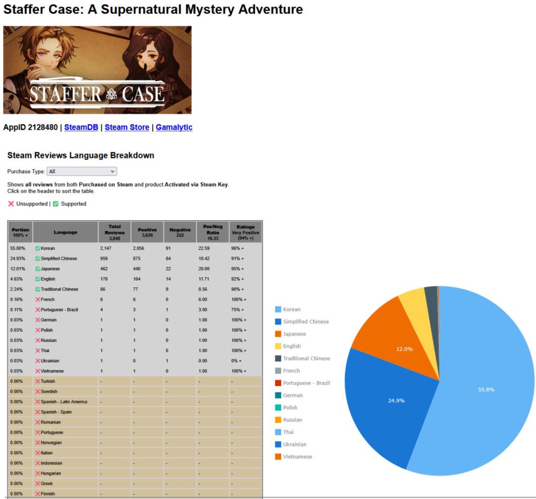今回はそんなプレイヤーから高く評価されてきた『Staffer Case:超能力推理アドベンチャー』のSteam版が、販売本数10万本を突破したそうだ。2023年4月の発売から、約3年越しでの10万本達成となる。なおSteamのレビュー分析ツール「Steam Scout 」のデータによれば、本作の言語別レビュー割合は韓国語が55.8%と過半数以上を占めており、中国語(簡体字)が24.9%、日本語が12.0%、英語が4.5%、中国語(繁体字)が2.2%と続く。本作は上記5言語に対応。開発元の地元であり、発売時点から対応していた韓国語のプレイヤーを中心に、日本や中国語圏、英語圏のプレイヤーからも受け入れられてきたのだろう。