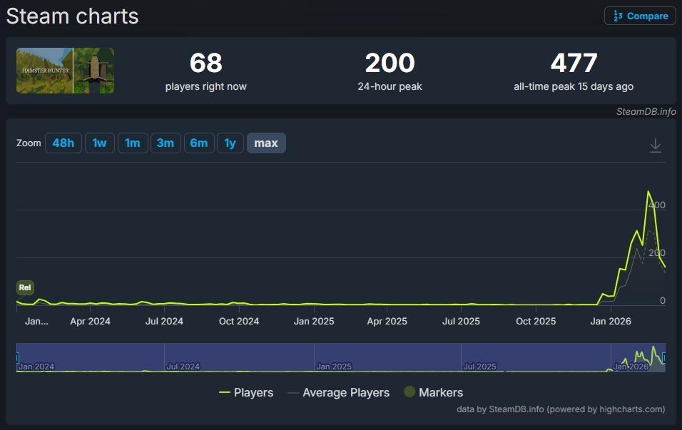 一方で本作は配信当初から人気作だったわけではない。Steam同時接続ユーザー数は、リリース月に25人を記録し、その後は長期にわたって1桁人数で推移していた。しかし、2025年12月から同時接続ユーザー数が突如として増加し、今年2月には477人を記録している(SteamDB)。この背景には、開発者自身が仕掛けたマーケティングが影響しているようだ。