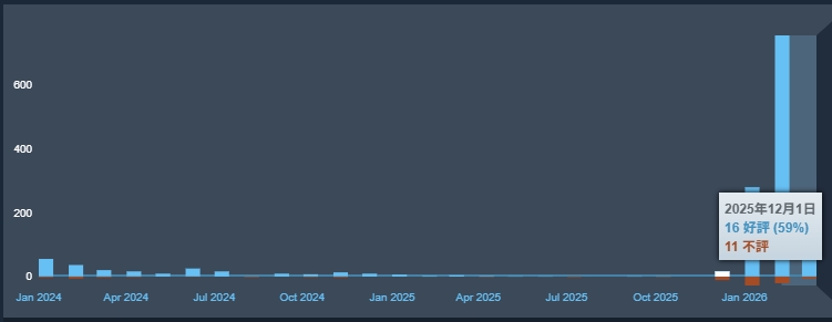 実際、動画マーケティングが始まった2025年12月のSteamユーザーレビューは、27件のうち16件が好評とする「賛否両論」ステータス。その後、今年1月の好評率は91%、2月と3月の好評率は97%になっており、アップデートの効果が発揮されている様子が見てとれる。とはいえレビューを見てみるとゲーム内容とはあまり関係のない、いわゆるネタ投稿のような簡素な内容も多い。先述のショート動画により一種のネットミーム的な盛り上がりを見せていることもうかがえる。
