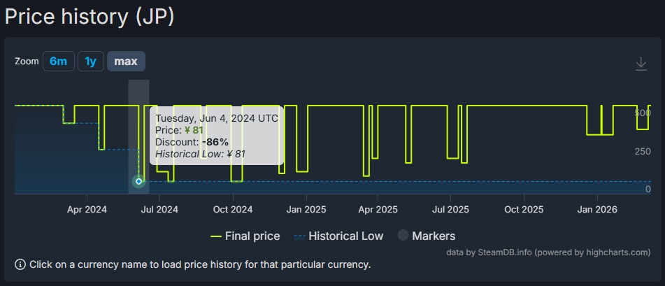 ちなみに本作は過去に最安値となる86%オフのセールが実施されていたが、マーケティング開始後は最安値よりもはるかに割引率の低い33%オフや27%オフなど段階的に縮小されている(SteamDB)。先述した通り、本作は過去のセール中も含めて長期にわたって同時接続ユーザー数は1桁で推移していた。一度埋もれてしまったゲームにとっては、セールよりもショート動画でのマーケティングの方が売上につながるという見方もできるだろう。