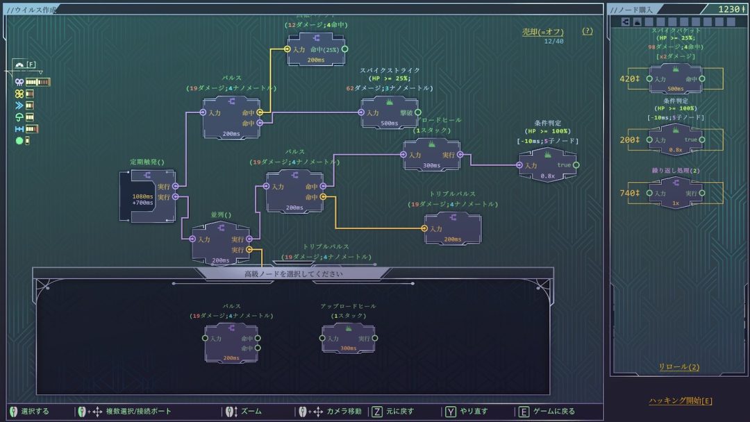 モジュールには、まず一定の条件にて実行命令を送信するルートノードが存在し、その出力から別のモジュールの入力へ接続すると、後者のモジュールの効果が実行される仕組みだ。精密な単体攻撃や画面全体を覆う範囲攻撃といった武器にあたるモジュールのほか、特定の効果を発動させたり、信号を分配させたりなど、多種多様な機能のモジュールが用意されている。